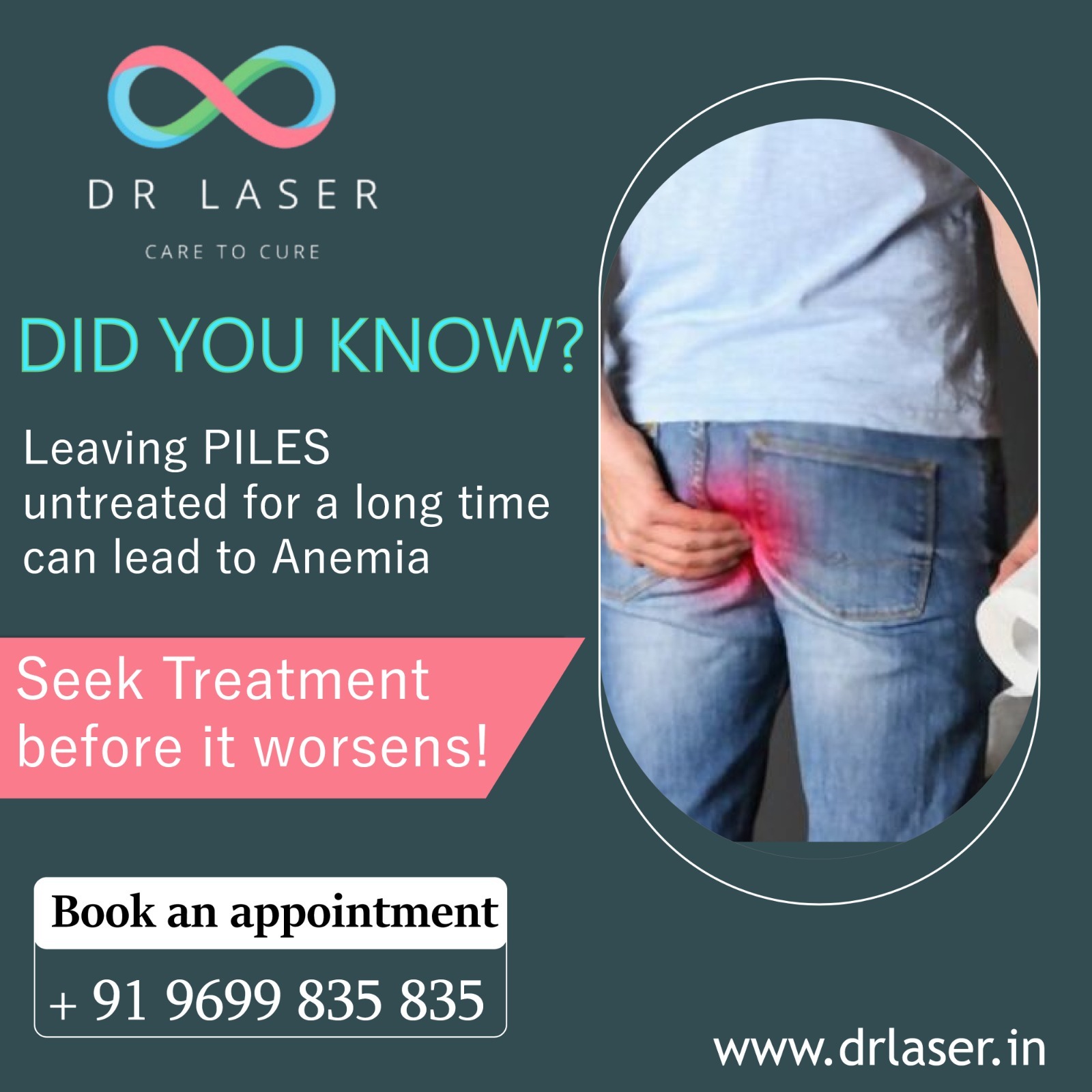 Don't ignore piles; seek treatment before it worsens. Contact Dr. Laser at +919699835835 for specialized care to cure piles and prevent complications like anemia. Visit www.drlaser.in to schedule a consultation today